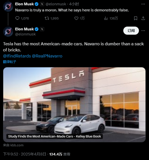 马斯克对此又一次怒批白宫贸易顾问纳瓦罗,称其为“汽车组装工”:他“真是个白痴”,他所说的显然是错误的。